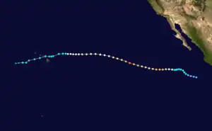 Overall, 26 tropical depressions formed, with 23 reaching tropical storm intensity. Thirteen of the tropical storms became hurricanes, with 10 reaching major hurricane intensity.[nb 5] El Niño-like conditions prevailed across much of the basin, leading to elevated activity. Sea surface temperatures were above average for much of the season, stretching from the coast of North America to near the 150th meridian east.[10] A subpolar gyre located in the Northern Atlantic increased atmospheric convection and reduced vertical wind shear across the Eastern Pacific. Wind shear near Hawaii's Big Island decreased even more after the subtropical jet pushed northward in September. Higher levels of humidity were present between 10°N–20°N at a height of 4,781–9,882 ft (1,457–3,012 m). Storms were also kept in more favorable environments by stronger easterlies as a result of an above-normal subtropical ridge.[11][12]