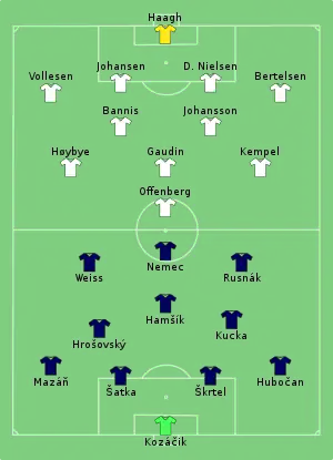 Adam Nemec opened the scoring for Slovakia in the 11th minute of the match with a header past goalkeeper Christoffer Haagh at the back post, following a chipped cross from Juraj Kucka on the right side. Denmark managed to create chances of their own, including two in the 25th minute after Kasper Kempel's cross was missed by Christian Offenberg and a shot from 11 metres (12 yd) out by Oskar Høybye went over the crossbar. Denmark held off the opposition attacks until the 37th minute, when Kucka registered his second assist of the match after laying a ball back to Albert Rusnák, who scored beneath the goalkeeper to put Slovakia up 2–0 at half-time.[6] Denmark remained well-organised and compact, despite finishing with one shot on target and only 27% possession.[38] The majority of the second period was played in Denmark's half, though the score remained unchanged until the 79th minute, when Danish substitute futsal player Adam Fogt scored an own goal past Haagh after failing to clear a low cross sent by Róbert Mak from the left and deflected by Michal Ďuriš.[39] Haagh made seven saves in the match, helping prevent a worse defeat for Denmark.[7]