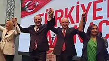 The main opposition Republican People's Party (CHP) began a wide search for a candidate, with several rumours that the party was content with supporting a cross-party candidate that was not necessarily in line with the party's values as part of an election alliance. CHP leader Kemal Kılıçdaroğlu subsequently conducted several meetings with the leaders of the Felicity Party and the İyi Party. Former President Abdullah Gül was mentioned as a cross-party option, allegedly receiving the support of senior officials, but was disbanded following heavy opposition from the lower ranks and voters. Gül eventually announced that he would not stand, citing the lack of cross-party consensus.[11] Despite ruling it out several times, party leader Kemal Kılıçdaroğlu was frequently mentioned as a potential candidate, along with Yılmaz Büyükerşen, İlhan Kesici, Muharrem İnce and Mehmet Haberal. Certain MPs, such as Öztürk Yılmaz and Didem Engin also publicly declared their interest.[12] On 26 April, CHP MP Özgür Özel, himself seen as a potential candidate, announced that their nominee would be one who would make the AKP 'crazy' the most.[13] On 4 May, Yalova MP Muharrem İnce was declared the party's candidate.[14]