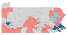 Democrats flipped at least 350 state legislative seats,[2] picking up most of those seats in states where President Trump's approval rating was relatively low.[3] Six chambers—the Colorado Senate, New Hampshire House, New Hampshire Senate, Minnesota House, Maine Senate and New York State Senate—flipped from Republican to Democratic control.[4] Additionally the Connecticut Senate went from being evenly divided to a Democratic majority.[4] Democrats also broke Republican legislative supermajorities in North Carolina,[5] Michigan and Pennsylvania[3] and gained a legislative supermajority in both houses of the California, Illinois and Oregon legislatures.[6][7]