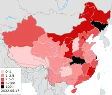 ![]() Confirmed COVID-19 cases in mainland China per 100,000 inhabitants by province as of 3 October 2020[1]