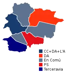Candidacies supported by Democrats for Andorra won the election in five out of seven parishes, while in Sant Julià de Lòria, the candidacy formed by Third Way and Lauredian Union won. The Social Democrats won in Escaldes-Engordany.[8][9]