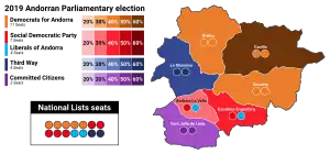 | Party or coalition | Canillo | Encamp | Ordino | La Massana | Andorra la Vella | Sant Julià de Lòria | Escaldes-Engordany | |