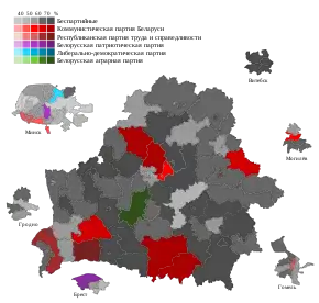 Only 21 of the 110 elected deputies were members of political parties, with all belonging to pro-government parties; the Communist Party of Belarus emerged as the largest party in the House of Representatives with 11 MPs, the Republican Party of Labour and Justice came second with six seats, the Belarusian Patriotic Party won two and the Agrarian Party and Liberal Democratic Party won a seat each.[13]