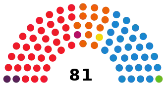 The Cortes of Castile and León were officially dissolved on 2 April 2019, after the publication of the dissolution decree in the Official Gazette of Castile and León.[7] The table below shows the composition of the parliamentary groups in the Cortes at the time of dissolution.[8]