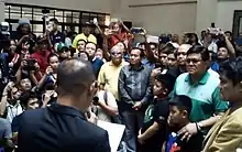 Osmeña named two of his allies, councilors Tumulak and Mary Ann de los Santos, as his possible candidate for vice mayor.[40] There were also reports of BOPK-allied barangay captains pushing for an Osmeña-Ong tandem but Ong declined since he wanted to focus as LNB President.[41] Osmeña officially declared de los Santos as his candidate for vice mayor during BOPK's rally at Lahug Elementary School gym. Osmeña also announced that BOPK was no longer affiliated with the Liberal Party (LP) as they have pledged allegiance to the Laban ng Demokratikong Pilipino (LDP) party of Senator Sonny Angara.[42]