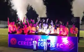 After failing to progress from the group stage in 2018, Ceres were determined to win the 2019 edition of the Copa Paulino Alcantara.[31][32] They were drawn in Group A alongside Mendiola, Green Archers United, and Philippines U22 (who are participating in preparation for the Southeast Asian Games[33]).[34] In their first group match, they were held to a 2–2 draw by Mendiola.[35] This was followed by wins over the two other clubs as Ceres topped the group.[36] In the semi-finals, they defeated Group B runners-up Stallion Laguna 4–3 to earn their first ever finals appearance.[37][38] On November 16, Ceres faced defending champions Kaya–Iloilo in the final. Ceres won the match 2–1, completing their domestic double.[39][40] Ceres won the final despite having only 14 players available in their squad, as the others were either resting or on international duty. Head coach Risto Vidaković was also absent for the final, thus it was assistant coach Jooc Treyes who managed the team.[40] The Copa's individual awards were all won by Ceres players: striker Robert Lopez Mendy, who scored five goals in the tournament, won the Golden Boot, goalkeeper Roland Müller won the Golden Glove, and midfielder Takashi Odawara won the Golden Ball for his defensive performances.[41][42] With the Copa win, Ceres finished their 2019 season without a single defeat in domestic competitions.[42]