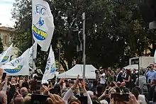 In March 2019, Nicola Zingaretti was elected secretary of the PD.[9] In April, Zingaretti presented a special logo for the election, including a large reference to "We Are Europeans", a manifesto launched by Carlo Calenda; and the symbol of the Party of European Socialists (PES).[10] Additionally, the PD is trying to forge an alliance with the Article One (Art.1)[11] and minor parties. March and April registered more developments on the centre-left side of the political spectrum. Under the new leadership of Benedetto Della Vedova, More Europe (+E) formed a joint list with Italia in Comune (IiC),[12][13][14] the Italian Socialist Party (PSI),[15] the Italian Republican Party (PRI),[16][17] the Italian section of the European Democratic Party (EDP),[18] the Liberal Democratic Alliance for Italy (ALI)[19] and minor parties; Italian Left (SI), the Communist Refoundation Party (PRC), minor parties and individual splinters from the disbanded Free and Equal (LeU) formed The Left (LS), a joint list inspired by the Party of the European Left (PEL);[20] and the Federation of the Greens (FdV), Possible (Pos) and Green Italia (GI) formed Green Europe (EV) under the banner of the European Green Party (EGP).[21][22] On the centre-right side, FI welcomed in its lists candidates of the Union of the Centre (UdC) and several alike minor parties while Brothers of Italy (FdI) formed a partnership with Direction Italy (DI) and minor groups.