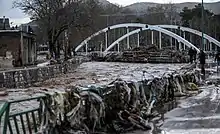 The flooding caused the destruction of hundreds of millions of dollars of infrastructure and the collapse of at least 314 bridges across the country.[46] Twenty-three of the nation's thirty-one provinces were affected. Agriculture suffered tremendous damage, with losses in the sector reaching 46 trillion rials (US$1.1 billion) by 3 April. Golestan accounted for the largest portion at 20 trillion rials (US$480 million).[44] At least 25,000 houses were completely destroyed, while another 60,000 sustained some form of damage.[47] 44 public libraries in Iran also suffered flood damage.[48] According to reports from Aljazeera, out of 800 villages affected by the flood in Golestan, 95 villages are yet to recover from it.[49]