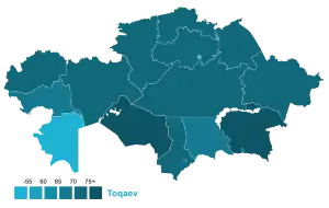 Snap presidential elections were held in Kazakhstan on 9 June 2019 to elect the President of Kazakhstan following the resignation of long-term President Nursultan Nazarbayev in March 2019.[1] This was the sixth presidential election held since Kazakhstan's independence. The elections were not free and fair, and were widely denounced as a sham. Acting president Kassym-Jomart Tokayev of Nur Otan won the election.