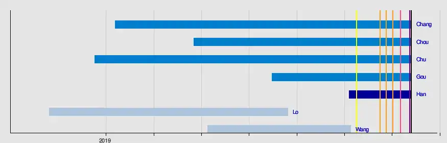 The Kuomintang announced five primary contestants on June 10, 2019: Chang Ya-chung, Chou Hsi-wei, Eric Chu, Terry Gou, and Han Kuo-yu.[24][25]
