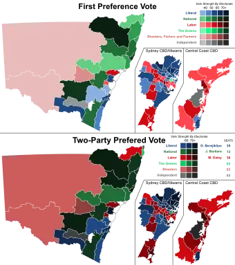 ![]() The top map shows the first party preference by electorate. The bottom map shows the final two-party preferred vote result by electorate. | ||||||||||||||||||||||||||||||||||||||||||||||||||||||||||||||||||||||||||
