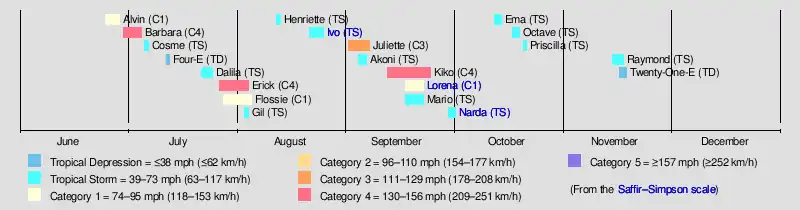 The season officially began on May 15 in Eastern Pacific and on June 1 in Central Pacific; both ended on November 30.[7] Initial activity was slow, with the first tropical depression forming on June 25. The strongest storm of the season, hurricane Barbara, reached peak intensity on July 2 as a high-end category 4 hurricane. The season became more active in July, with five tropical cyclones forming, including two storms that intensified into hurricanes. Among them was Hurricane Erick, which reached Category 4 status on July 31.[8] This level of activity came to a halt in August, with only three named storms forming, none of which reached hurricane strength.