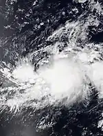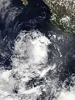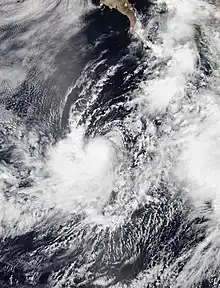 The tropical wave that spawned Cosme was succeeded a week later by another. It entered the East Pacific on July 8 but remained disorganized for several days while tracking west. The wave gave way to an area of low pressure on July 12, which then organized into a tropical depression only six hours later. The depression was located over very warm sea surface temperatures but under the influence of moderate wind shear, preventing organization. By July 12, persistent upper-level winds began to shear away the cyclone's convection. It degenerated to a remnant low at 00:00 UTC on July 14 while located south-southwest of Baja California Sur. The low produced intermittent bursts of convection as it moved west-northwest but ultimately dissipated early on July 15.[16]
