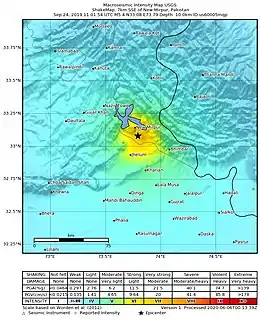 The 2019 Kashmir earthquake struck regions of Pakistan with an epicentre in Azad Kashmir[3] on 24 September at 16:02 local time (11:02 UTC). It had a magnitude of 5.4 Mww and a maximum felt intensity of VIII (Heavily damaging) on the European macroseismic scale.[4] There was severe damage in Mirpur District, causing the deaths of 40 people and injuring a further 850.[5] The epicentre of the shallow quake was near the city of Mirpur, Pakistan.[6] The tremors were felt in the Kashmir region, Punjab (Pakistan), Punjab (India), Uttarakhand and northern parts of India including New Delhi.[7]
