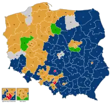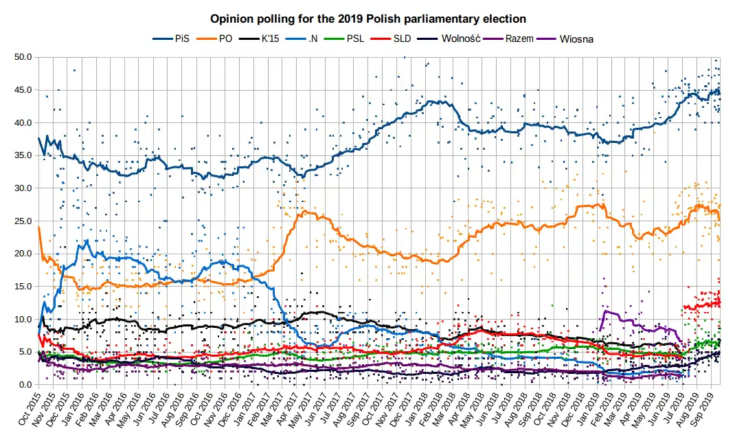 In February 2019 the Wiosna party was founded as a left wing anticlerical party.[13] For the 2019 European Parliament elections, the opposition formed a wide coalition, the European Coalition, with the exception of Wiosna. However, PiS won the European elections. Following the loss, the European Coalition dissolved and the Confederation lost many member parties and leaders.[14] In June 2019 Modern and the Civic Platform formed a joint parliamentary club.[15] August 6, the Left was formed, a de facto coalition of Razem, SLD and Wiosna, de jure carrying the SLD name.[16] On August 8, 2019 PSL allied with Kukiz'15 in an alliance named "Polish Coalition".[17]