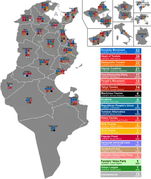 The 217 members of the Assembly of the Representatives of the People were elected by closed list proportional representation in 33 multi-member constituencies (27 in Tunisia and 6 representing Tunisian expatriates). Seats were allocated using the largest remainder method. Lists must adhere to the zipper system with alternating female and male candidates, and must have a male and female candidate under the age of 35 in the top four in constituencies with four or more seats.[2]