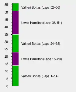Bottas crossed the finish line to take his fourth victory of 2019 and the seventh win of his career. Hamilton held off Verstappen to take 2nd place and with it his sixth World Drivers' Championship, making him the outright second most accomplished Formula One driver of all time ahead of Juan Manuel Fangio and behind Michael Schumacher. This also marked Hamilton's 150th podium finish.
