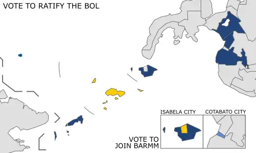 - January 21 – A plebiscite takes place with the majority of voters deciding to ratify the Bangsamoro Organic Law creating the Bangsamoro Autonomous Region and abolishing the Autonomous Region in Muslim Mindanao.[5] Cotabato City also votes to join the new autonomous region while in Isabela City in Basilan rejects its inclusion to the region.[6][7]