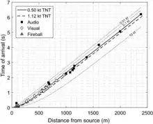 Aouad et al. (2021) derived the kinematics of the fireball from publicly available videos. Considering a time of separation between the fireball and the shock wave at about 170 milliseconds, they concluded a TNT equivalent mass of 0.2 +/- 0.08 kt of TNT or 520 +/- 200 tons of ammonium nitrate at a distance of 130 meters from the explosion center.[64] This result is consistent with Dewey 2021 that suggests that the Beirut explosion TNT equivalence is an increasing function of distance.[65]