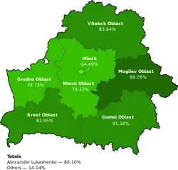 Incumbent Alexander Lukashenko was announced by the Central Election Commission (CEC) to have won a sixth term in office, crediting him with just over 80% of the vote.[2] Lukashenko has won every presidential election since 1994,[3] with all but the first being labelled by international monitors as neither free nor fair.[4]