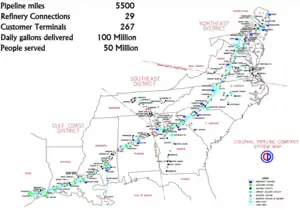 Throughout its history, the pipeline has seen several notable safety incidents and oil spills.[2][10] In the 1990s, two spills from the pipeline in the Southeastern United States resulted in an investigation by the National Transportation Safety Board, leading to changes in how the federal government investigated pipeline accidents.[2] This included a spill that damaged the Reedy River in South Carolina, which was one of the worst natural disasters in the state's history.[6] Additionally, in a 2016 incident, the pipeline leaked approximately 300,000 U.S. gal (1,100,000 L) in a spill near Birmingham, Alabama.[10] In later repair work related to the spill,[10] two contractors were killed and four injured in an explosion and subsequent fire while performing excavator work.[2] According to the Pipeline and Hazardous Materials Safety Administration (PHMSA, an agency of the United States Department of Transportation),[11] the pipeline ranked seventh among fuel and oil pipelines for the number of accidents "impacting people and the environment" (IPE), but when adjusted for its length and the amount of fuel carried, it performed better than many other pipelines.[2] Additionally, consulting firm RPC, Inc. found that, among the ten largest pipelines in the United States, the Colonial Pipeline Company had the lowest rate of IPE accidents affecting their pipelines, and in early August 2020, the American Petroleum Institute announced that the company was awarded its "Distinguished Pipeline Safety Award" based on its performance in 2019.[2] The announcement came just four days before a leak was discovered in North Carolina.[2]