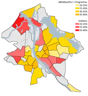 | 2017 Riga City Council election | 50,8 | 9,3 | 13,7 | - | 6,3 | 13,4 | 3,3 | - | 1,5 | - | 0,32 | 1,3 | 37,1 | ||||
