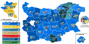 The parties which formed the previous coalition: PP, BSPzB and DB failed to gain a majority only reaching 98 of the seats. Meanwhile the two pro-Russian and nationalist parties VAZ and the new formed Bulgarian Rise (led by former interim prime minister Yanev) both made gains.[39] GERB became largest party with around 25% and 67 seats. ITN failed to reach the 4% threshold.[40]