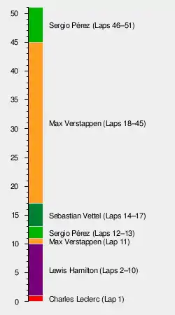 On lap 8, Alonso became the first driver to make a pit stop for fresh tyres, and Leclerc followed suit one lap later. On lap 11, Sainz outbraked himself into the turn 8 chicane, dropping him from 6th to 15th and finding himself having to reverse out of a very narrow run off onto the racing line.[26][27] Hamilton was the first driver from the top three to make a pit stop. In an otherwise tidy stop, his exit from the pit box was delayed due to Gasly driving the pit lane behind him, costing him about two seconds. The following lap, Verstappen made his stop, giving Pérez a temporary lead. Pérez then stopped the lap after, but the wheelgun of the rear-right mechanic failed; the spare was used and the stop was completed. Following the stops, both Red Bulls jumped Hamilton, dropping him to fourth place, with Vettel, yet to make a pit stop, temporarily in the lead. Vettel stayed out for another four laps, maintaining speed before finally coming to the pit lane and exiting the pits in seventh place, over-cutting Tsunoda with his new tyres, seven laps fresher than the tyres of Gasly, Hamilton, and all the runners in front of him.[26][27]