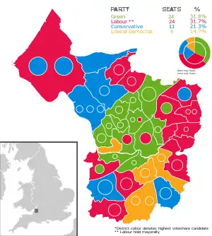 ![]() Map showing the results of the 2021 Bristol City Council elections. Blue showing Conservative, Green showing Green, Red showing Labour and Yellow showing Liberal Democrats. Striped wards have mixed representation. | |||||||||||||||||||||||||||||||||||||||||||||||||||||||||||||||||
