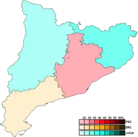 As a result of no regional electoral law having been approved since the re-establishment of Catalan autonomy, the electoral procedure came regulated under Transitory Provision Fourth of the 1979 Statute, supplemented by the provisions within the Organic Law of General Electoral Regime.[lower-alpha 2] Voting for the Parliament was on the basis of universal suffrage, which comprised all nationals over 18 years of age, registered in Catalonia and in full enjoyment of their political rights. Additionally, Catalans abroad were required to apply for voting before being permitted to vote, a system known as "begged" or expat vote (Spanish: Voto rogado).[21] The 135 members of the Parliament of Catalonia were elected using the D'Hondt method and a closed list proportional representation, with an electoral threshold of three percent of valid votes—which included blank ballots—being applied in each constituency. Seats were allocated to constituencies, corresponding to the provinces of Barcelona, Girona, Lleida and Tarragona, with each being allocated a fixed number of seats.[20][22]
