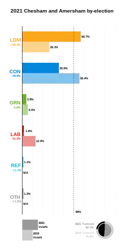 A by-election was held in the United Kingdom Parliament constituency of Chesham and Amersham on 17 June 2021, following the death of the sitting member, Dame Cheryl Gillan, on 4 April 2021. Gillan had served as MP for the constituency since 1992.[2] The by-election was the third to the 58th Parliament, which was elected in 2019.[3]