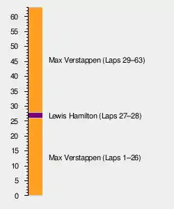 Just before the restart, Verstappen almost spun at Rivazza, but managed to maintain control; he kept the lead and pulled away for the rest of the race.[30] Behind him, Lando Norris overtook the Ferrari of Charles Leclerc for second place, while Perez and Yuki Tsunoda spun at Villeneuve and Tamburello respectively, dropping them down to 14th and 15th.[28] Hamilton, starting ninth after the red flag, worked his way upwards through the field, and eventually managed to pass the stubborn McLaren of Norris for second place on lap 60.[32] Norris achieved his second podium with third-place, following an equal placing at Austria the previous year. Hamilton claimed the bonus point for fastest lap, allowing him to maintain the lead in the championship over Verstappen.[36]