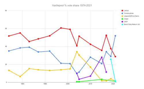 A by-election for the House of Commons constituency of Hartlepool in the former county of Cleveland, England, was held on 6 May 2021. The by-election was triggered following the resignation of Labour Member of Parliament (MP) Mike Hill, who resigned over allegations of sexual harassment.[1] It was held on 6 May 2021 alongside elections to the Borough Council, Tees Valley Mayor, and Cleveland Police and Crime Commissioner.[2] The seat is part of the "red wall", a set of constituencies that historically supported the Labour Party but where the party is being challenged by increasing Conservative support.[3]
