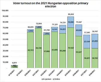 An opposition primary was held in Hungary, between 18–28 September 2021 (first round) and 10–16 October 2021 (second round), to select the candidate for Prime Minister of Hungary[1][2] supported by the opposition parties to form a coalition to compete in the 2022 parliamentary election. It was the first countrywide primary election in the political history of Hungary. The parties had also selected common candidates for single-member districts via the primary.[3]