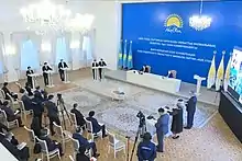 Following the 2016 Kazakh legislative election, the ruling Nur Otan party maintained its supermajority control of the Mäjilis, which it has held since 2007.[5] After Nursultan Nazarbayev's resignation from the presidency on 20 March 2019 and the snap presidential elections which were held on 9 June 2019, newly elected President Kassym-Jomart Tokayev in his inauguration on 12 June promised a continuation of Nazarbayev's policies in the country's development and social and economic reforms.[6] Despite resigning from office, Nazarbayev still holds the title of "Elbasy" ("Leader of the Nation"), and remains chairman of the Security Council of Kazakhstan for life, is the Nur Otan party chairman, and a Constitutional Council member, while his eldest daughter Dariga Nazarbayeva held the post of Senate Chair, the second line of succession in the country after the President.[7] Many analysts considered that Tokayev's presidency would be temporary, and would only serve as a bridge for an eventual transition of power to Nazarbayeva.[8]