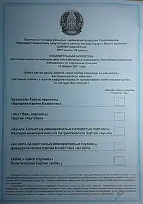 - "На выборы народу готовят зелёные, розовые и голубые бюллетени". diapazon.kz (in Russian). 2020-12-28. Archived from the original on 2021-01-13. Retrieved 2021-01-10.