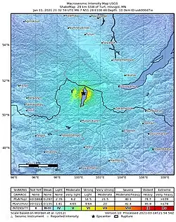 The earthquake was the largest in Mongolia since a 7.0 event in 1967.[5] It was initially reported as 6.8 Mw, before being downgraded to 6.7.[6] It was located about 50 km from the Mongolian town of Turt, and 55 km from the Russian border.[7][8] According to PAGER, 17,000 people felt moderate to strong shaking.[8] It was felt as far away as Irkutsk and Cheremkhovo in Russia.[9]
