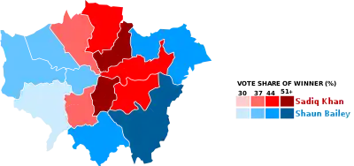 Sadiq Khan of the Labour Party was re-elected, winning 40% of first preference votes and 55% in a run-off against Bailey.