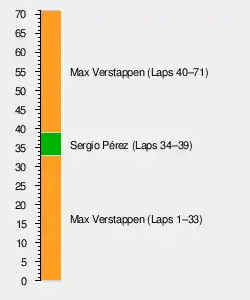 Max Verstappen was leading most the race with Sergio Perez taking the lead for a short while, during the period that Verstappen had pitted and he hadn’t. Perez became the first Mexican driver to lead his home Grand Prix. Lewis Hamilton was in second with Verstappen having a clear lead over him. Hamilton and Perez were close towards the end with Perez not far from trying to get past him.[20] Hamilton managed to keep second place and Perez came home to finish third. By finishing 3rd, Pérez became the first Mexican driver to get a podium at home.[21]