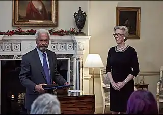 Gurnah received his Nobel Prize medal and diploma from Ambassador Mikaela Kumlin Granit during a simple ceremonial presentation at the Swedish Ambassador's Residence in London, United Kingdom on December 6, 2021.[19][20] Dr. Bashir Abu-Manneh, Head of the university's School of English, said: "It is right that Professor Gurnah is being awarded the Nobel Prize for Literature... and recognized for a literary craft that is infused by humanity’s common pursuit of justice. This is the story of our times, and Professor Gurnah has been telling it for decades."[20]