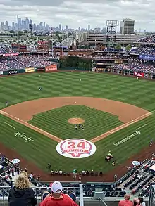 Due to the COVID-19 pandemic, no fans were in attendance at any MLB games in 2020 until the National League Championship Series.[13] On November 12, 2020, Commissioner of Baseball Rob Manfred said that the MLB would be "more aggressive" about having fans in ballparks, but that in-person attendance was still dependent on local public health authorities.[14] On March 2, the City of Philadelphia announced that, beginning on Opening Day, Citizens Bank Park would be allowed to host fans at 20% capacity (8,800 attendees).[15] Citizens Bank Park implemented a new set of rules for all game attendees, including a face mask requirement, a ban on backpacks and purses, and the use of cashless payments at concession stands and team stores.[16] Additionally, attendees were to be seated in "pods" of between two and six seats, evenly dispersed across the ballpark. All other seats were cordoned off to enforce social distancing.[17]