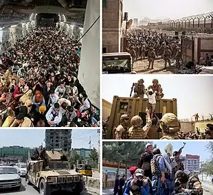 ![]() Clockwise from top left: Afghans fleeing Kabul Airport aboard a US Boeing C-17 Globemaster III, US Marines assisting at an evacuation checkpoint at Hamid Karzai International Airport, coalition soldiers assist a child during the evacuation, armed Taliban fighters in Kabul, Taliban fighters aboard a captured Humvee | |||||||||