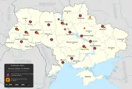 During the autumn and winter of 2022–2023, Russia launched waves of missile and drone strikes against energy infrastructure as part of its invasion of Ukraine.[2] The strikes targeted civilian areas beyond the battlefield, particularly critical power infrastructure,[3][4] which is considered a war crime.[5][6]
