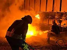 On 11 October, seven people were killed and 49 injured by missile strikes on Kyiv.[59] The Kyiv Metro's red line and the interchange node at Teatralna–Golden Gate were closed. Most underground stations continued to operate as bomb shelters.[44] Areas struck by missiles included a children's playground.[60] Fires broke out in six cars, and more than 15 cars were damaged.[61]