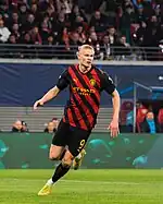 A second consecutive 0–0 Champions League away draw, to Dortmund on 25 October was sufficient to ensure City would qualify for the last 16 as group winners with one game to spare. On 2 November, Rico Lewis scored his first senior goal in a 3–1 win against Sevilla; he became the all-time youngest scorer on a first start in a Champions League match and City's youngest ever Champions League scorer, aged 17 years and 346 days.[31] Three days later, City beat Fulham 2–1 in the league at the Etihad, having played for over an hour with ten men after João Cancelo had been sent-off when adjudged to have deliberately denied Harry Wilson a goal-scoring opportunity with a shoulder charge. City's winner was scored in the fifth minute of injury time by Haaland, netting a penalty after De Bruyne had been fouled. This led to ecstatic scenes afterwards with Guardiola encouraging his players to thank the crowd with a lap of honour.[32]