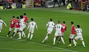 On 22 August, United achieved their first league victory of the season, a 2–1 home win against rivals Liverpool. Jadon Sancho scored 15 minutes into the first half and Marcus Rashford early in the second, before Mohamed Salah scored a consolation goal that made him the fixture's outright top scorer with 10 goals. This was United's first league win against Liverpool since March 2018.[22] In the next match, United visited Southampton on 27 August. Bruno Fernandes scored the game's only goal with a volley as United won their first away match in the league and won back-to-back league matches for the first time since February 2022. Casemiro made his United debut when he came on as a substitute in the 80th minute.[23] On 1 September, United achieved a second away victory as they won 1–0 against Leicester City. Sancho scored the only goal after 23 minutes as United won three league matches in a row for the first time since December 2021.[24] On 4 September, United obtained their fourth consecutive league victory with a 3–1 home win against rivals Arsenal. Antony scored the opening goal 35 minutes into his United debut, before Bukayo Saka equalised at the hour mark. Rashford then scored two goals in order to secure victory against Arsenal, who were on top of the league table, having started the season on a five-match winning streak.[25]