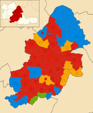 Since its formation Birmingham City Council has variously been under Labour control, Conservative control and no overall control. Councillors have predominantly been elected from the Labour Party, Conservative Party and the Liberal Democrats. The council has had an overall Labour majority since the 2012 council election, when they regained control from the Conservative-Liberal Democrat coalition that had run the city since 2004.[4] In the most recent council election in 2018, Labour won 67 seats with 50.2% of the vote, the Conservatives won 25 seats with 28.8% of the vote, the Liberal Democrats won 8 seats with 14.1% of the vote and the Green Party won a single seat with 4.4% of the vote.[5]
