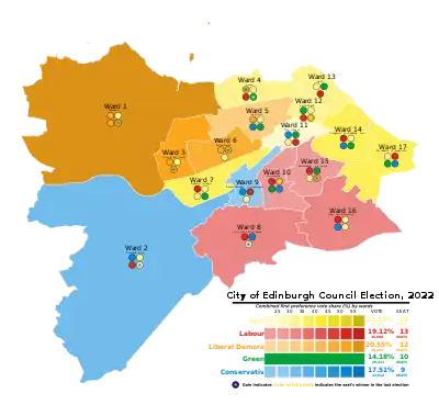 The 2022 election to the City of Edinburgh Council took place on Thursday 5 May 2022, on the same day as the 31 other local authorities in Scotland.[2] The election used the same 17 wards used in 2017; each ward elects three or four councillors using the single transferable vote system (a form of proportional representation).