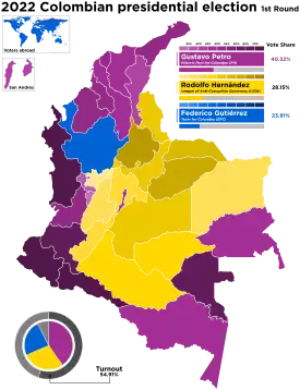 Presidential elections were held in Colombia on 29 May 2022, with a runoff on 19 June 2022 as no candidate obtained at least 50% in the first round of voting. Iván Duque, who was elected president in 2018, was ineligible to run due to term limits.[1] Gustavo Petro, a senator and former Mayor of Bogota, defeated Rodolfo Hernández Suárez, former Mayor of Bucaramanga, in the runoff election.[2] Petro's victory made him the first left-wing candidate to be elected president of Colombia,[3][4] and his running mate, Francia Márquez, is the first Afro-Colombian elected to the vice-presidency,[5] as well as the second female vice-president overall.[6]